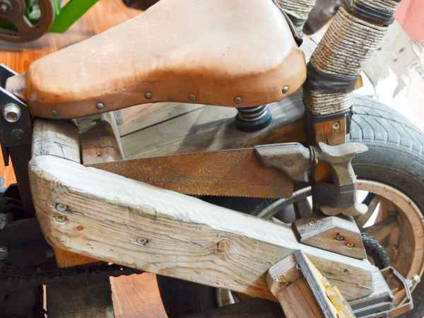Kurios war das "Agrar-Bike", das mit einem Rüttelplatten-Motor läuft. Der Erfinder und Erbauer Wilfried Knörr hat nicht nur das in stundenlanger Handarbeit aus Teilen, die ihm seine Kumpels vorbei gebracht haben, zusammengebaut - sondern auch noch eine echte Zimmermannsarbeit hat er "verspaxt": Die Holzuki. Das gute Stück läuft stolze 100 km/h mit einem Suzuki-Motor. Über den Fahrkomfort hat sich Wilfried allerdings nicht geäußert. In Serie wird dieses Stück Holz mit Zapfhahn und Fuchsschwanz wohl nicht gehen.