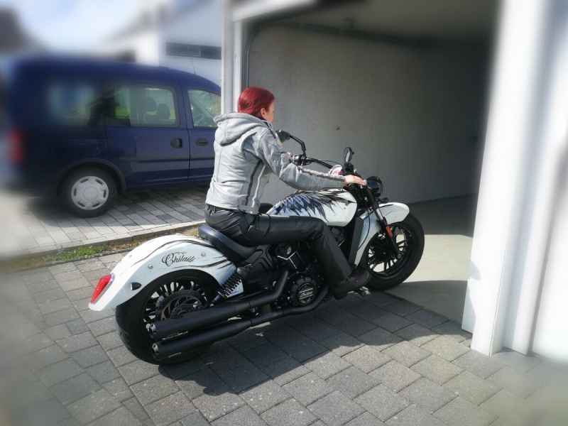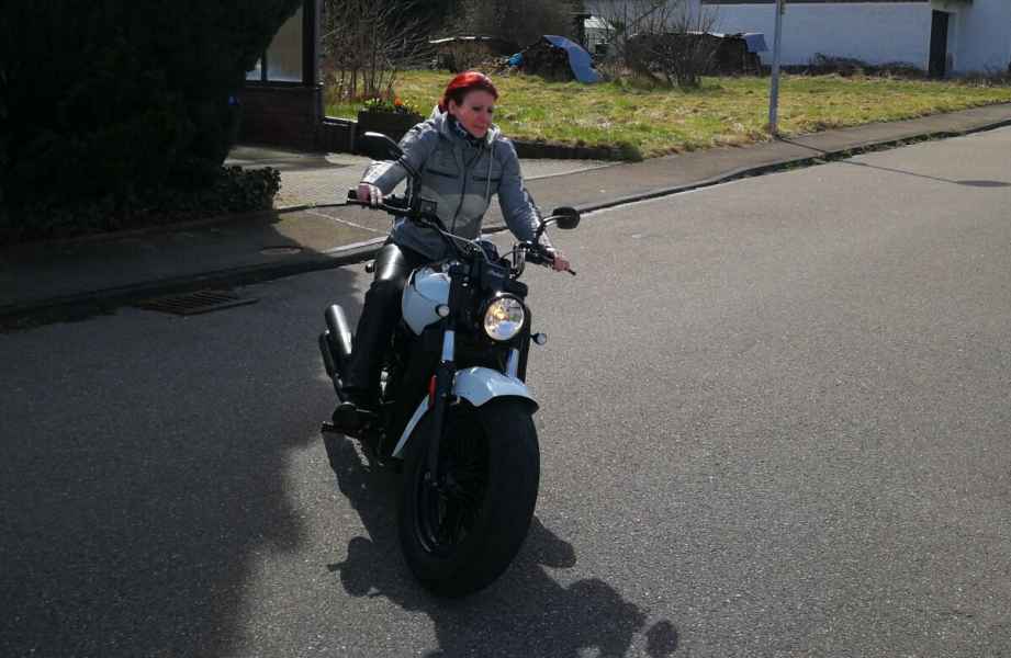 Mit den neuen Klamotten war ich natürlich schon unterwegs: Lederjacke, Schuhe, Helm. Mit der Leggings war ich zur TÜV-Abnahme. Leider war das Fahrgefühl nicht so, wie ich das erwartet hatte. Meine Meinung dazu in einem eigenen Beitrag.