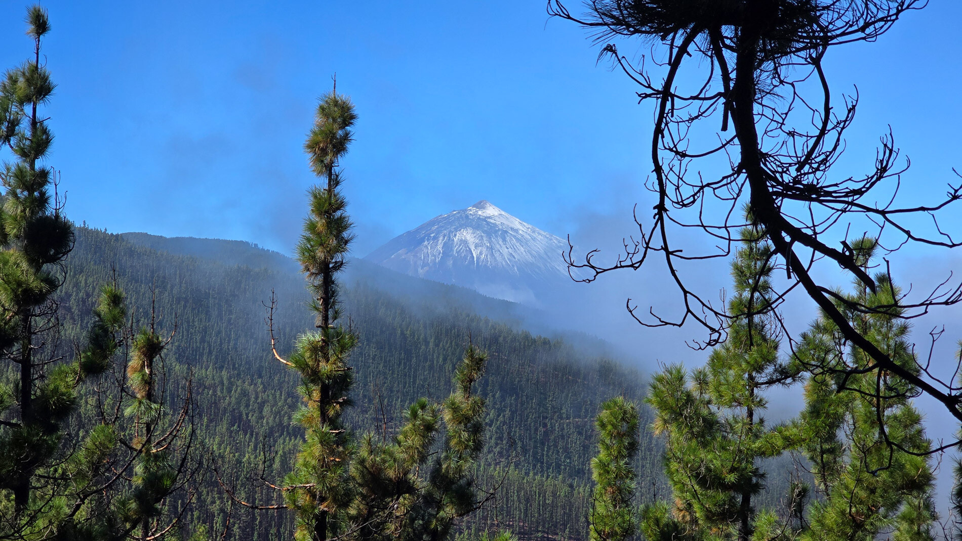 An einem Aussichtspunkt öffnet sich der Blick auf den Teide. Wolkenumwabert und majestätisch.